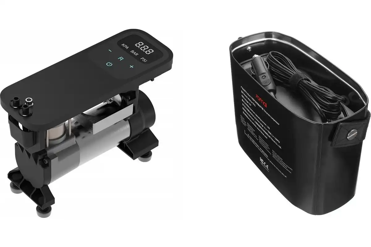 Воздушный компрессор с цилиндрами из анодированного алюминиевого сплава и немецким поршнем способен поднять давление до 7 атмосфер. Стандартная автомобильная шина накачивается в среднем за 3 мин. Корпус выполнен в форме небольшого металлического ящика с удобной ручкой-лямкой. Компрессор имеет встроенные кабель питания с адаптером в прикуриватель и мягкий резиновый шланг.